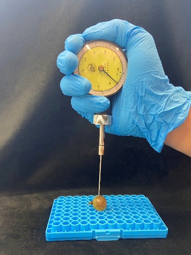 Abb. 1: Penetrometermessung an der Haut einer Weintraube (Foto: FiBL, Ruslan Eliseev und Ana Maria Arribas).