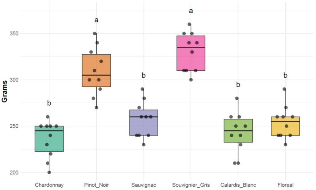 Abb. 2: Penetrometer-Werte, die die Grammzahl angeben, die erforderlich ist, um die Nadel des Penetrometers durch die Beerenhaut zu drücken. Die beiden traditionellen europäischen Sorten Chardonnay (weiße Beeren) und Pinot Noir (rote Beeren) sind links von vier PIWI-Sorten (alle weiße Beeren) dargestellt. Alle Bewertungen wurden an Beeren mit 70° Oechsle durchgeführt. Die Buchstaben weisen auf einen signifikanten Unterschied nach Anova + Tukey-Test p < 0,05 hin.