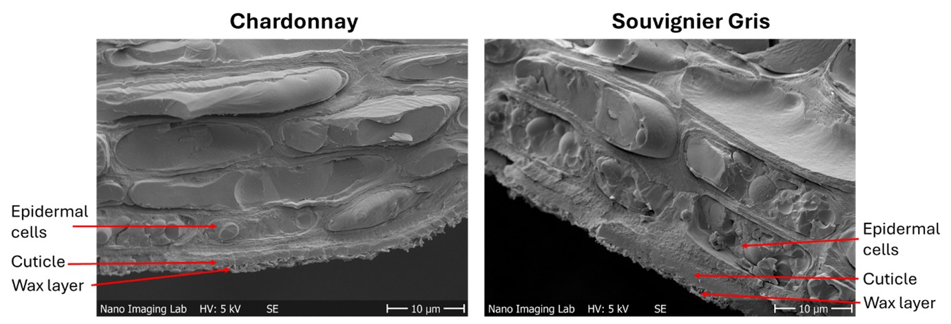 Vorläufige Beobachtungen zeigen bemerkenswerte Unterschiede, wobei die PIWI-Sorte Souvignier Gris besonders hervorsticht: Ihre Haut ist sowohl dicker – aufgrund einer dickeren Cuticulaschicht und größeren Epidermiszellen – als auch härter, was dazu beitragen kann, Botrytis-Infektionen zu begrenzen.